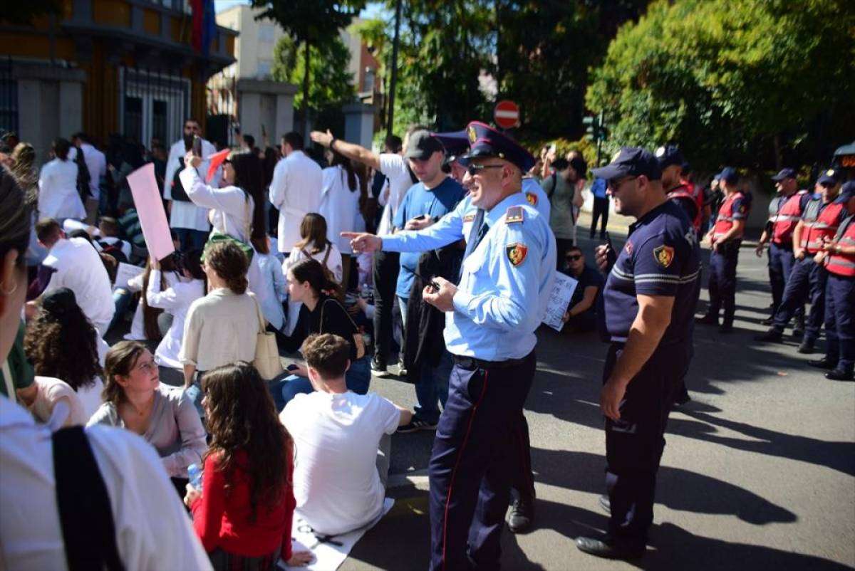 Tiran Tıp Fakültesi'nde bir araya gelen tıp öğrencileri, Arnavutluk Eğitim ve Spor Bakanlığı binası önüne geçerek zorunlu istihdama karşı gösteri düzenledi.
