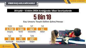 - "28 Eylül-12 Ekim 2024 tarihleri arasında siber devriyelerimiz, 5 bin 18 sosyal medya hesabındaki paylaşımlarda suç unsuru tespit etti" - "Bu hesapların paylaşımlarının 2 bin 705'i asayiş, 1184'ü terör, 383'ü güvenlik, 84'ü siber, 95'i narkotik, 70'i kaçakçılık ve 497'si diğer suç türleri olduğu belirlendi"