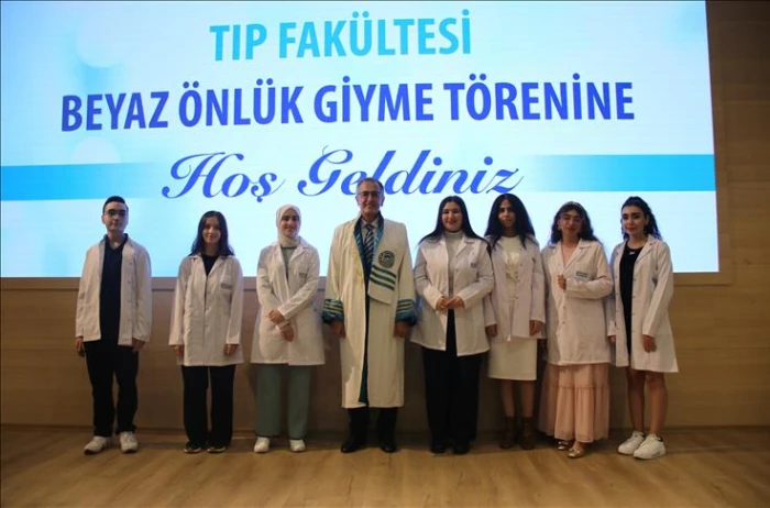 Tıp fakültesi öğrencilerinin, öğretim üyelerinin ellerinden beyaz önlüklerini giydiği törende, toplu hatıra fotoğrafı da çekildi.