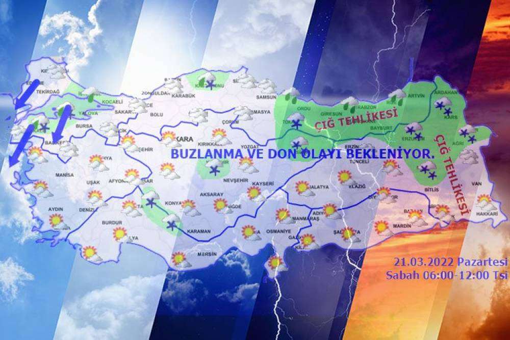 Meteoroloji verilerine göre yeni günlük hava durumu tahmin raporu yayımlandı. Marmara Denizi'nde kuvvetli fırtına, Akdeniz Bölgesi ile kıyı Ege'de kuvvetli rüzgar ile zirai don, Batı Karadeniz'de yoğun kar yağışları bekleniyor.