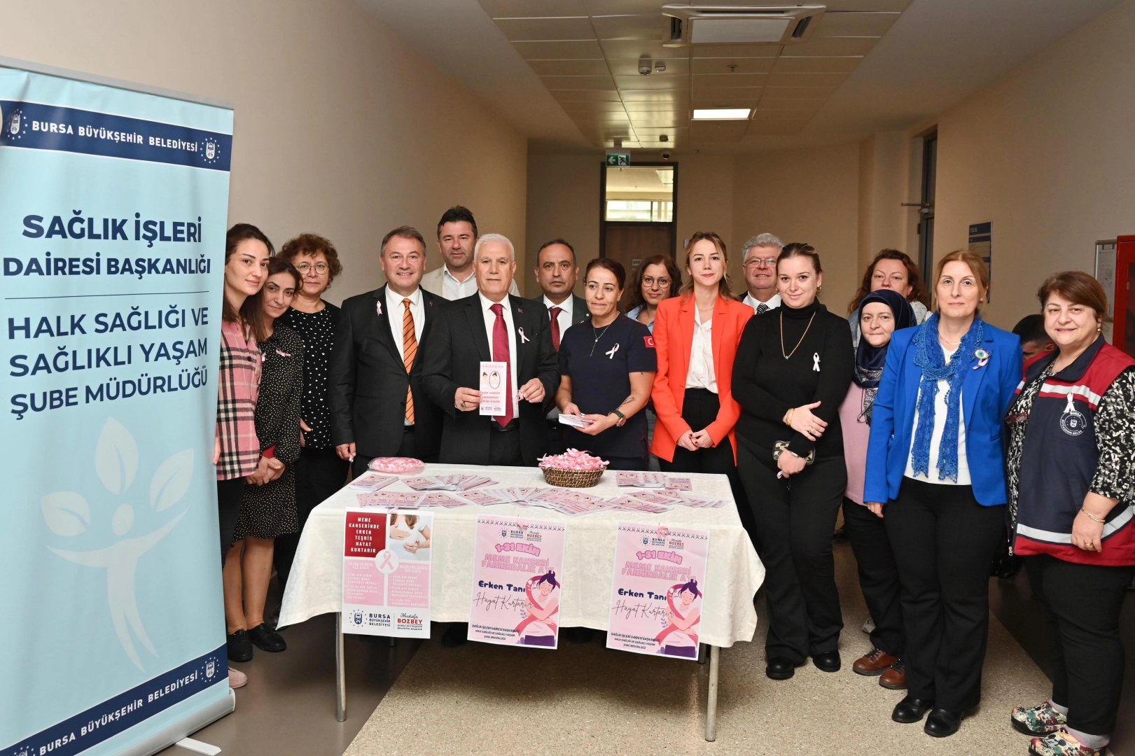 Bursa Büyükşehir Belediyesi tarafından ‘Meme Kanseri Farkındalık Ayı’ etkinlikleri kapsamında belediye personeline pembe kurdele ve bilgilendirme broşürü dağıtıldı. Başkan Mustafa Bozbey’in de katıldığı etkinlikte, erken teşhisin önemine dikkat çekildi.