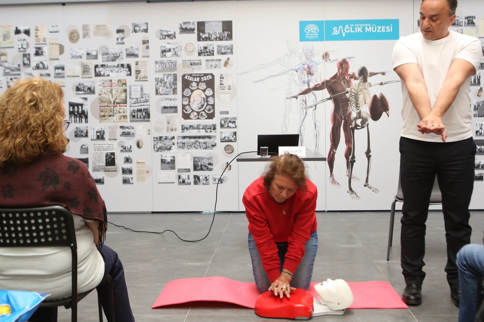 Bursa Nilüfer Belediyesi Dr. Ceyhun İrgil Sağlık Müzesi’nde gerçekleşen etkinlikte, İş Güvenliği ve İlk Yardım Uzmanı Hasan Hür, doğru ilk yardım müdahaleleri hakkında bilgi vererek, uygulamalı olarak gösterdi.