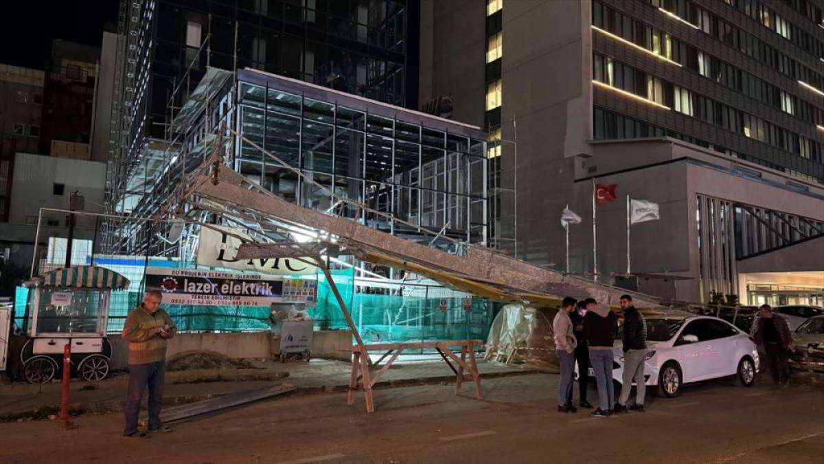 Bursa'da kuvvetli lodos yüzünden devrilen inşaat iskelesi otomobile zarar verdi
