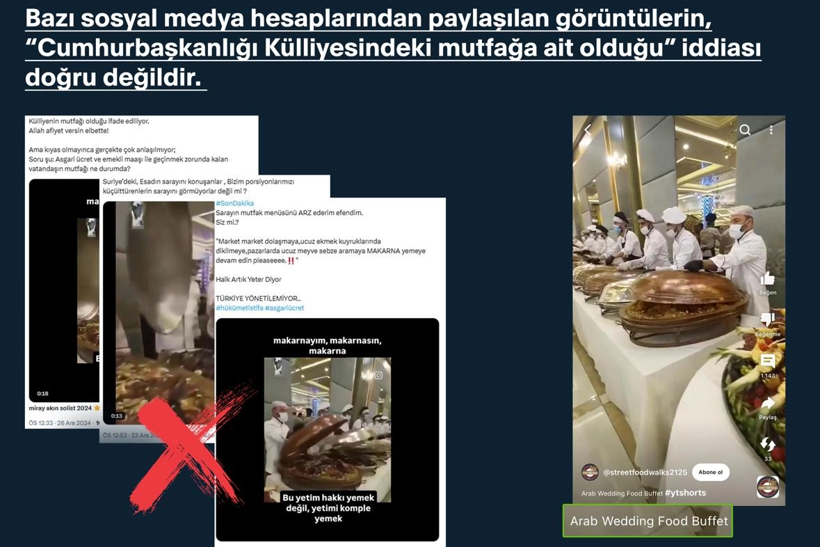 Söz konusu iddiaya konu görüntülerin Pakistanlı bir içerik üreticisi tarafından sosyal medya platformlarında, 'Suudi düğün yemeği büfesi' başlığıyla paylaşıldığı ve Türkiye ile herhangi bir ilgisinin bulunmadığı tespit edildiği belirtilirken, "Görüntülerden alınan bir bölümün, ses eklenerek manipülasyon amaçlı kullanıldığı belirlenmiştir. Kamuoyunu manipüle etmeye yönelik asılsız iddialara itibar etmeyiniz" ifadeleri yer aldı.