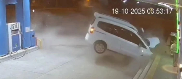 Otomobilin yakıt pompalarına çarpması iş yerinin güvenlik kamerasınca kaydedildi.