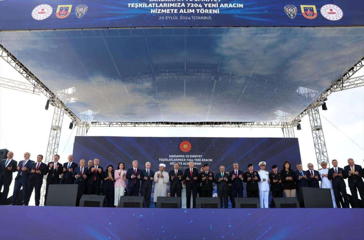 İSTANBUL (AA) - Cumhurbaşkanı Recep Tayyip Erdoğan, emniyet ve jandarma teşkilatında ömrünü tamamlayan taşıtların yenilendiğini belirterek, "Trafik ve asayiş hizmetleri için alınan ve hizmete sunulan bu araçlarımızın 5001 tanesini emniyet teşkilatımız kullanacak, 2203 adedini ise jandarma teşkilatımız kullanacak. Bu araçlar, asayiş, terör ve uyuşturucuyla mücadele başta olmak üzere güvenlik faaliyetlerimizin daha etkin yürütülmesini kolaylaştıracaktır." dedi.