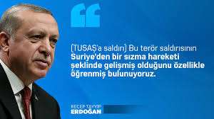 Cumhurbaşkanı Erdoğan: "(TUSAŞ'a) Bu terör saldırısının Suriye'den bir sızma hareketi şeklinde gelişmiş olduğunu özellikle öğrenmiş bulunuyoruz"