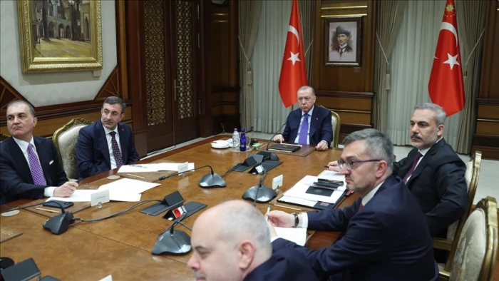 Toplantıda, Cumhurbaşkanı Yardımcısı Cevdet Yılmaz, Dışişleri Bakanı Hakan Fidan, Cumhurbaşkanlığı İletişim Başkanı Burhanettin Duran, Cumhurbaşkanı Dış Politika ve Güvenlik Başdanışmanı Akif Çağatay Kılıç, Cumhurbaşkanlığı Güvenlik ve Dış Politikalar Kurulu Başkanvekili Çağrı Erhan ve AK Parti Genel Başkan Yardımcısı ve Parti Sözcüsü Ömer Çelik de Cumhurbaşkanı Erdoğan'ın yanında hazır bulundu.