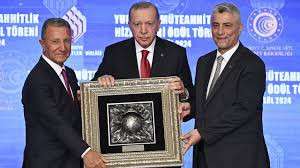Konuşmasının ardından Cumhurbaşkanı Erdoğan'a, "dünyayı inşa eden Türk müteahhitliğini" simgeleyen, dünyaya giydirilmiş ay yıldızlı bayrağı taşıyan baret rölyef takdim edildi.
