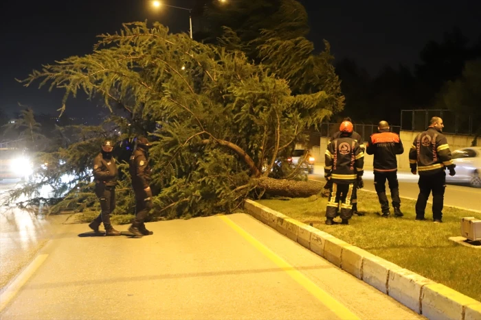 Ali Aygören Bulvarı'nda refüjde bulunan çam ağacı kökünden sökülerek yola devrildi.