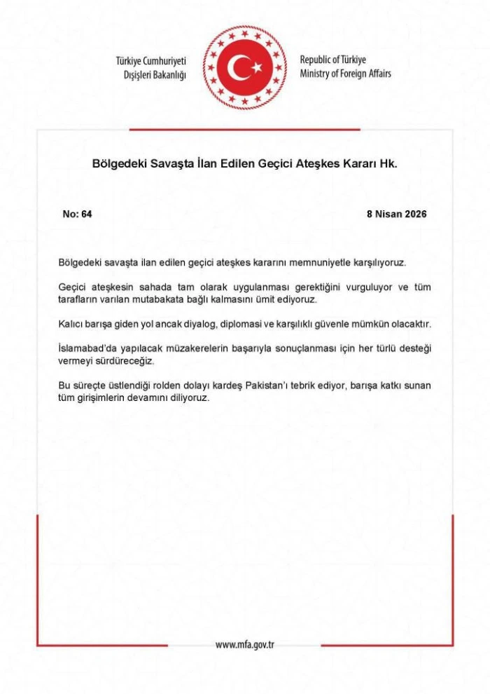 Dışişleri Bakanlığı: "(ABD-İran) Geçici ateşkesin sahada tam olarak uygulanması gerektiğini vurguluyor ve tüm tarafların varılan mutabakata bağlı kalmasını ümit ediyoruz"