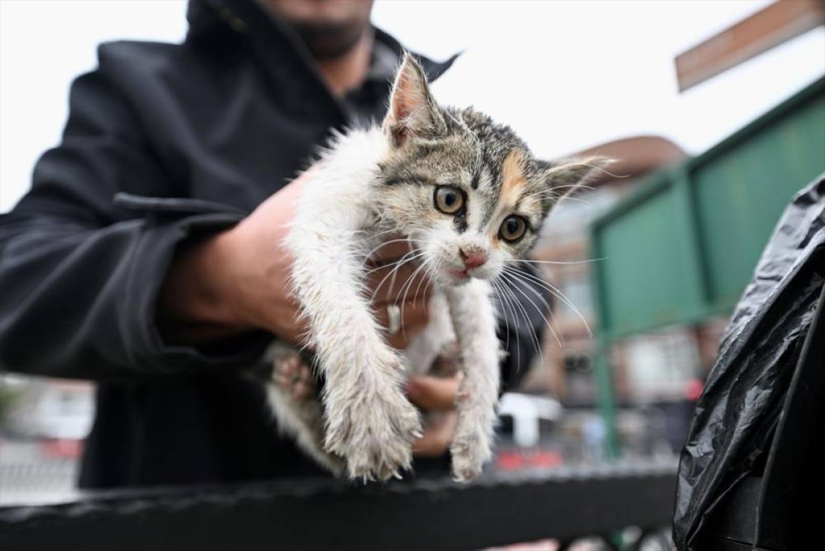 Taksici Ceylan tarafından sahiplenilen kedi yavrusu, taksi durağına getirilerek kurulandı, daha sonra hayvana mama verildi.