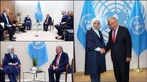 Cumhurbaşkanlığı kaynaklarından edinilen bilgilere göre, BM 79. Genel Kuruluna katılmak üzere ABD'ye gelen Cumhurbaşkanı Erdoğan ile birlikte New York'ta bulunan Emine Erdoğan'ın, BM Genel Merkezi'nde gerçekleşen görüşmede Guterres'e yeniden bir araya gelmekten memnuniyet duyduğunu söylediği öğrenildi.