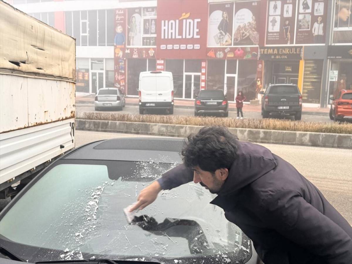 Vatandaşlar buz tutan araçların camlarını kazıcı yardımıyla çözmeye çalıştı.