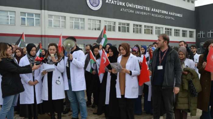 Atatürk Üniversitesi Araştırma Hastanesi Başhekimlik önünde toplanan sağlık çalışanları, İsrail'in Gazze saldırısına yönelik sağlık personelleri ve vatandaşlara bilgilendirme broşürleri dağıttı.