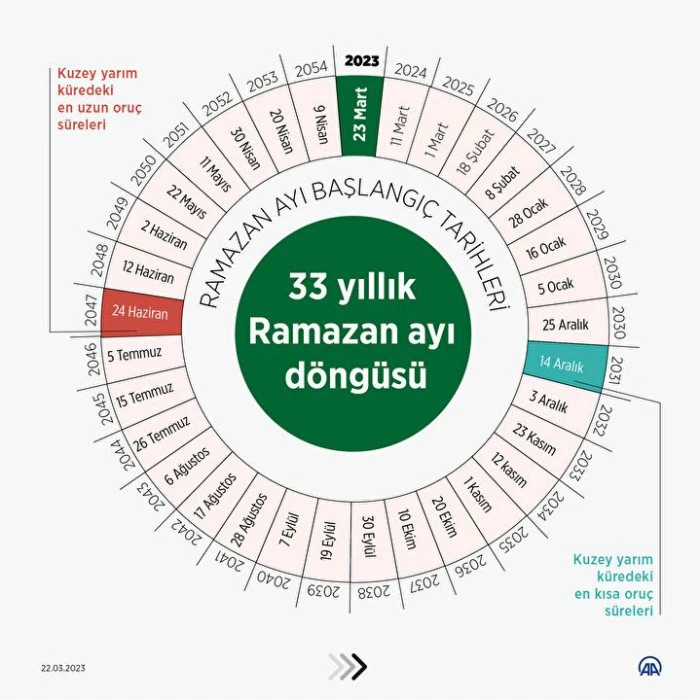 Kuzey yarım kürede yaşayan Müslümanlar için bu yıl oruç süreleri geçen yıla göre biraz daha kısa olacak ve 2031'e kadar kademeli olarak kısalmayı sürdürecek. 2031'de kuzey yarım kürede en kısa, güney yarım kürede ise en uzun oruç süreleri görülecek.