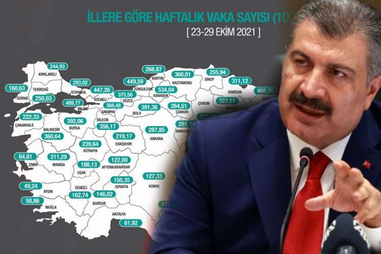 Sağlık Bakanı Fahrettin Koca, sosyal medya hesabından yaptığı paylaşımda, illere göre 23-29 Ekim'de her 100 bin kişide görülen COVID-19 vaka sayılarını açıklayarak, 23-29 Ekim arasında vaka yoğunluğu bir önceki haftaya göre en çok artan şehirleri de sıraladı.