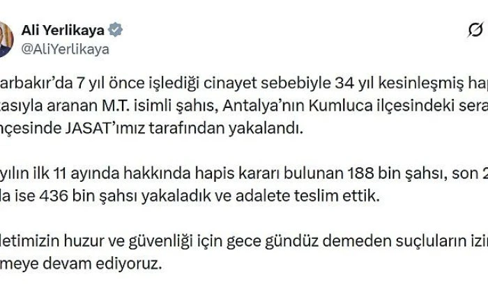 ANKARA (AA) - İçişleri Bakanı Ali Yerlikaya, Diyarbakır'da 7 yıl önce işlediği cinayet sebebiyle 34 yıl kesinleşmiş hapis cezasıyla aranan hükümlünün, jandarma ekiplerince Antalya'da yakalandığını bildirdi.