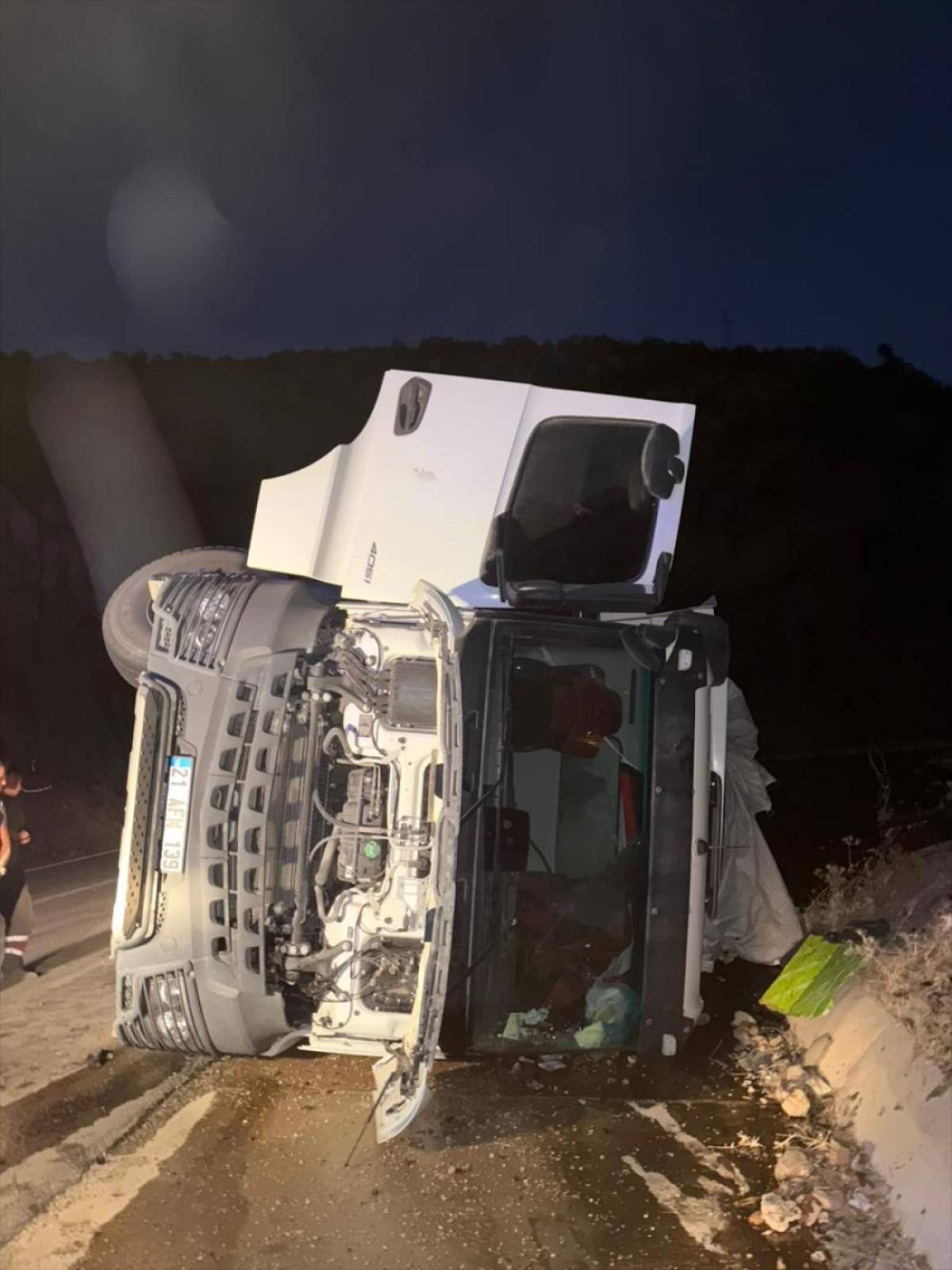 Bitlis- Hizan kara yolunun Nazar mevkisinde Ş.T idaresindeki 21 AFH 139 plakalı hafriyat kamyonu yol kenarına devrildi.