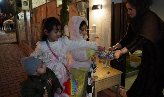 Çocuklar ellerine çanta ya da poşetlerini alıp ev ev dolaşarak kapı önlerine kendileri için kurulan masalardan şeker topladı.