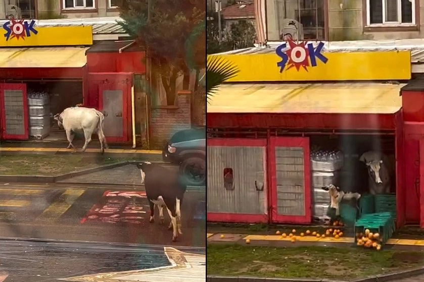 Çok sayıda beğeni ve yorum alan görüntülerde, markete giren iki ineğin marulları yediği, bu sırada temizlik yapan bir personelin elindeki paspasla hayvanları uzaklaştırdığı ve girişteki meyve sebze kasalarının devrilme görüntüleri şaşkınlık içinde izlendi.