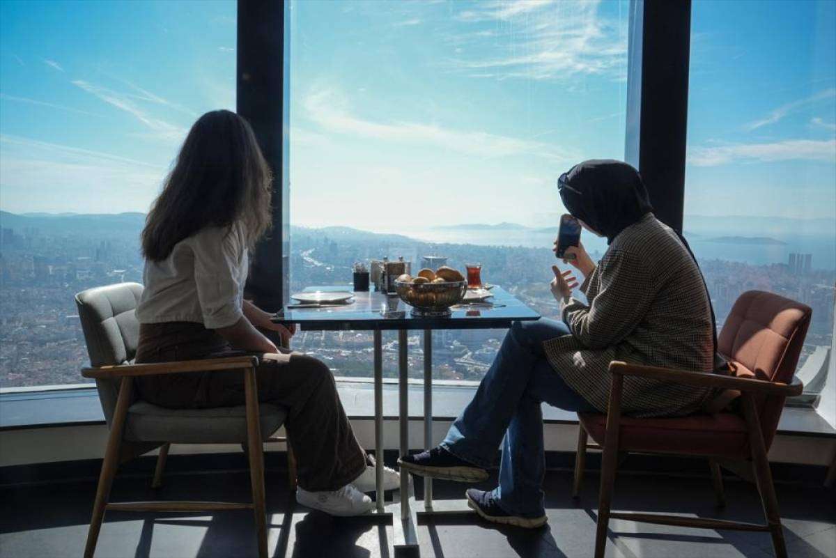Çamlıca Kulesi'ndeki etkinlikte gençler İstanbul manzarası eşliğinde kahvaltı yaptı, seyir terasından kente baktı.