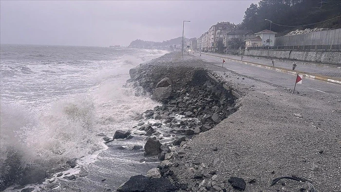 Sahildeki istinat duvarlarının bir kısmı yıkılırken, dalgaların taşıdığı kum ve taş yığınları sahil yolunu kapladı.