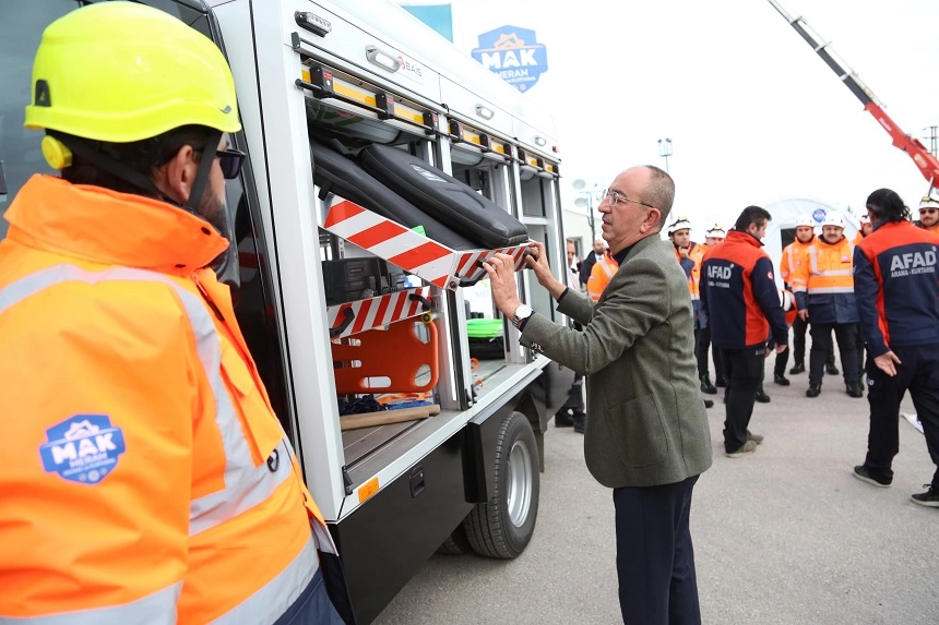 Başkan Kavuş ve beraberindekiler arama kurtarma ekibinden araçlar, teçhizat ve donanım hakkında bilgi aldılar.