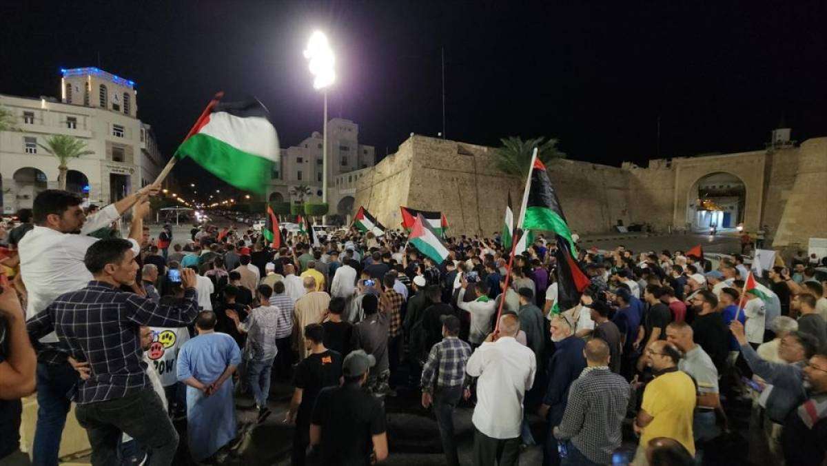 Filistin bayrakları taşıyan göstericiler, "Canımız, kanımız sana feda olsun ey Mescid-i Aksa", "Ey Gazze, yalnız değilsin, Misrata yaralarını saracak", "Allah'tan başka ilah yoktur. Biden Allah'ın düşmanıdır" sloganları attı.