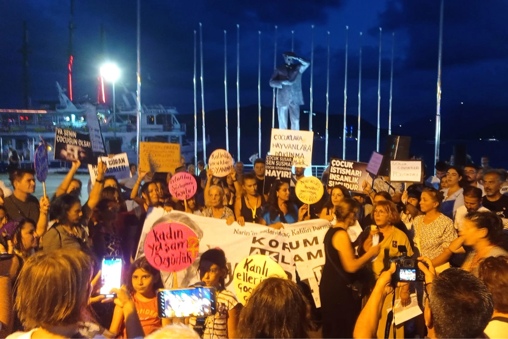 Muğla’nın Marmaris ilçesinde kadınlar Diyarbakır’da kaybolduktan 19 gün sonra cesedi bulunan 8 yaşındaki Narin için yürüdü, Atatürk meydanında bir araya gelerek cinayeti protesto etti.