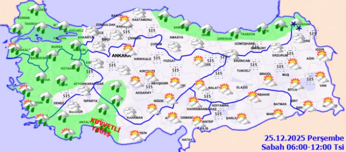 ANKARA (İGFA) - Meteoroloji Genel Müdürlüğü, 25 Aralık Perşembe gününe ilişkin hava tahmin raporunu yayımladı.