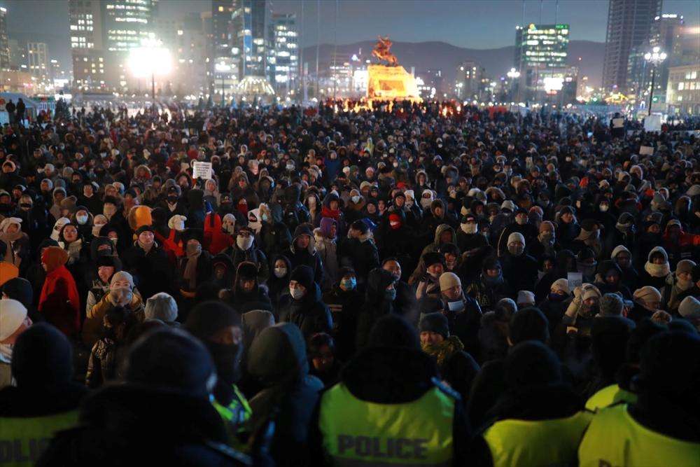 Ulan Batur'da hava sıcaklığı -28 derece olmasına rağmen gösteriler devam ediyor.