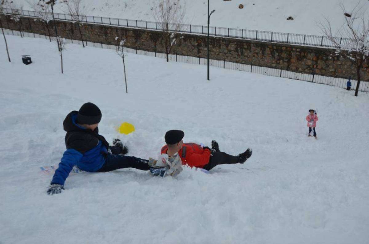 Kar yağışı ve beraberinde gelen tatili fırsat bilen çocuklar, kar topu oynadı, eğitimli arazide naylonlarla kayarak eğlendi.
