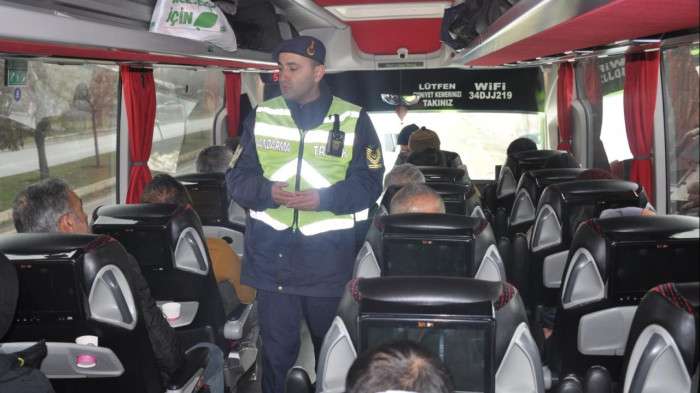 Yolcu otobüslerinde seyahat eden yolcuların emniyet kemeri kontrollerini yapan ekipler, seyahat edenlere emniyet kemeri kullanmanın önemini anlattı, broşür dağıttı.