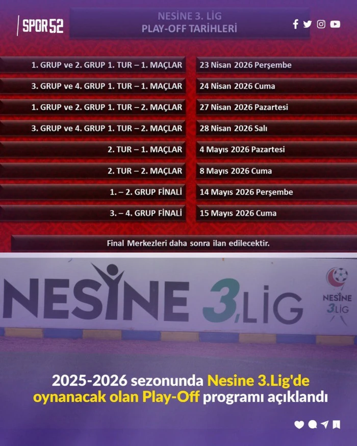 İSTANBUL (AA) - Futbolda Nesine 3. Lig'de 1. ve 2. Grup play-off 2. tur müsabakalarının programı belli oldu.