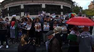 Paris'in ünlü Cumhuriyet Meydanı'nda toplanan kadın hakları savunucuları, İsrail'in 1 yıldır saldırılarına maruz kalan Gazze'de ateşkes sağlanması çağrısında bulundu.