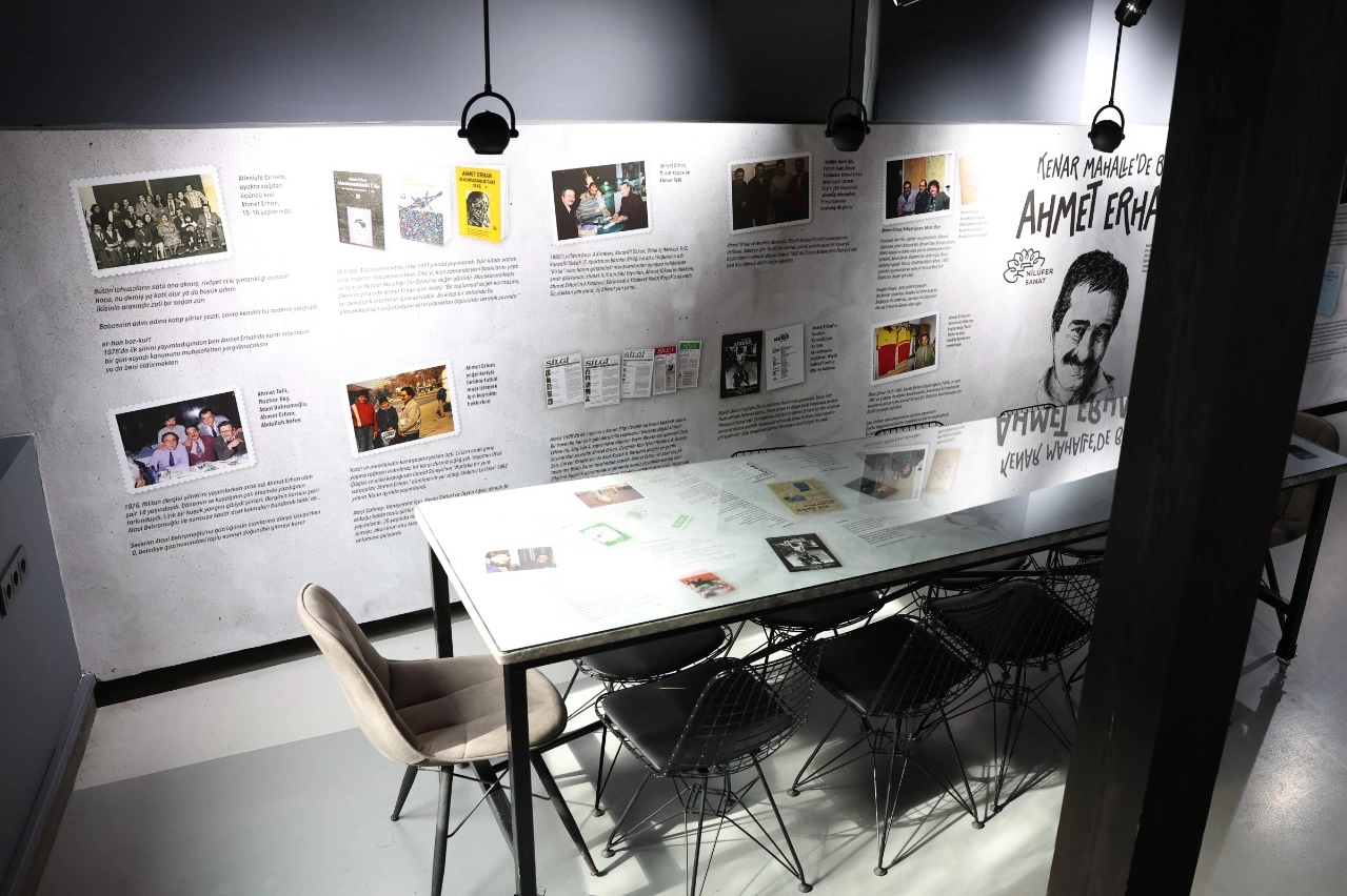 Açılışı yapılan “Kenar Mahallede Bir Ahmet Erhan” sergisi, şairin dünyasına görsel bir yolculuk sunuyor. Küratörlüğünü C. Hakkı Zariç’in yaptığı sergide; Ahmet Erhan’ın kitaplarının ilk baskıları, kişisel fotoğrafları, mektupları ve özel eşyaları yer alıyor. Serginin en dikkat çeken bölümlerinden birini ise ressam Habip Aydoğdu’nun, şairin kitap kapakları için özel olarak hazırladığı akrilik taslaklar oluşturuyor. Ayrıca Vahit Akça’nın hazırladığı çizimler de sergiye renk katıyor.