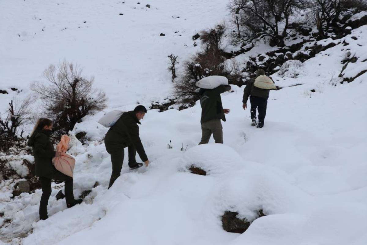 SİRT (AA) - Siirt'in Şirvan ilçesinde kar nedeniyle yiyecek bulmakta zorluk çeken yaban hayvanları için doğaya yem bırakıldı.