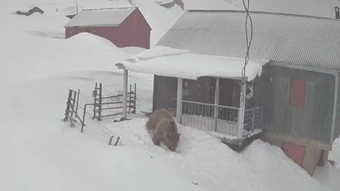 Görüntülerde, evden çıkan ayının bir süre kapının önünde beklediği, ardından da karla kaplı yaylada gezinerek bölgeden uzaklaşması yer aldı.