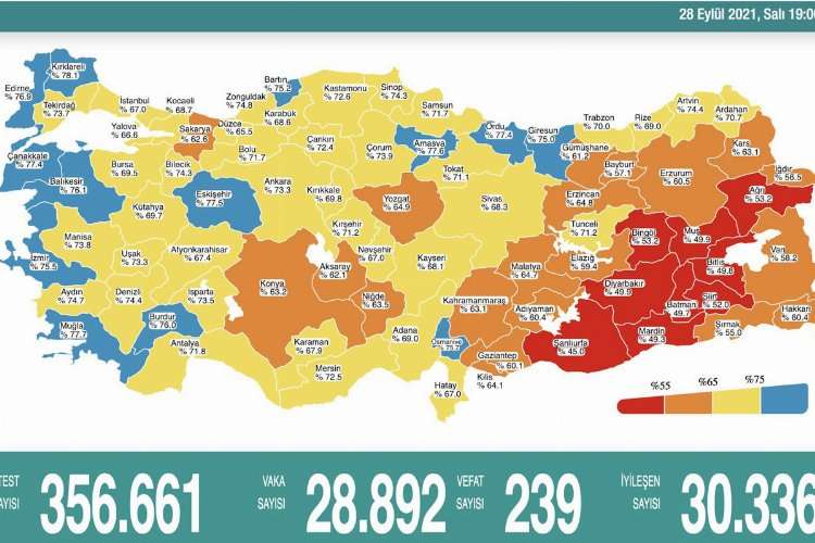 ANKARA (İGFA) - Son 24 saatte 28 bin 892 yeni vaka tespit edildi, 239 kişi hayatını kaybetti, 30 bin 336 kişi sağlığına kavuştu. Sağlık Bakanlığınca Günlük Koronavirüs Tablosu, "covid19.saglik.gov.tr" adresinden paylaşıldı.