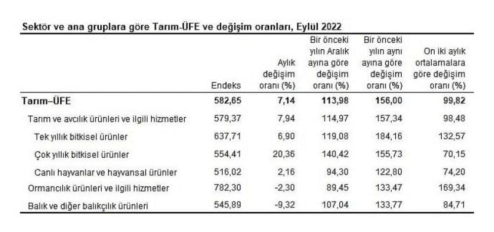 Tarım-ÜFE'de (2015=100), 2022 yılı Eylül ayında bir önceki aya göre 7,14, bir önceki yılın Aralık ayına göre 113,98, bir önceki yılın aynı ayına göre 156,00 ve on iki aylık ortalamalara göre 99,82 artış gerçekleşti.