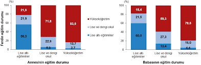 Buna göre, kendisi 14 yaş civarında iken annesi yükseköğretim mezunu olan fertlerin, şu anki eğitim seviyesi incelendiğinde, yüzde 2,7'sinin lise altı, yüzde 13,7'sinin lise ve dengi, yüzde 83,5'inin ise yükseköğretim mezunu olduğu görüldü.