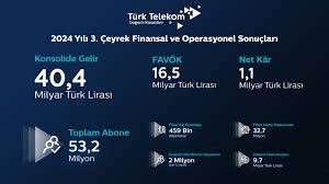 Türk Telekom'un 2024 üçüncü çeyrekteki net karı ise 1,1 milyar lira oldu. Şirketin bu dönem sonunda toplam abone sayısı 53,2 milyon olurken, Türkiye'nin her köşesinde yüksek hızlı internet sunma amacıyla sürdürdüğü çalışmaların sonucunda, fiber ağının uzunluğu 459 bin kilometreye yükseldi. 2024'ün ikinci çeyreği itibarıyla 32,4 milyon haneyi kapsayan fiber ağ, 2024'ün üçüncü çeyreğinde 32,7 milyon haneye ulaştı.