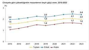 Buna göre, yükseköğretim mezunlarının beyin göçü oranı 2015'te yüzde 1,6 iken, 2023'te yüzde 2 oldu. Bu oran kadınlarda yüzde 1,6, erkeklerde ise yüzde 2,4 olarak kayıtlara geçti.