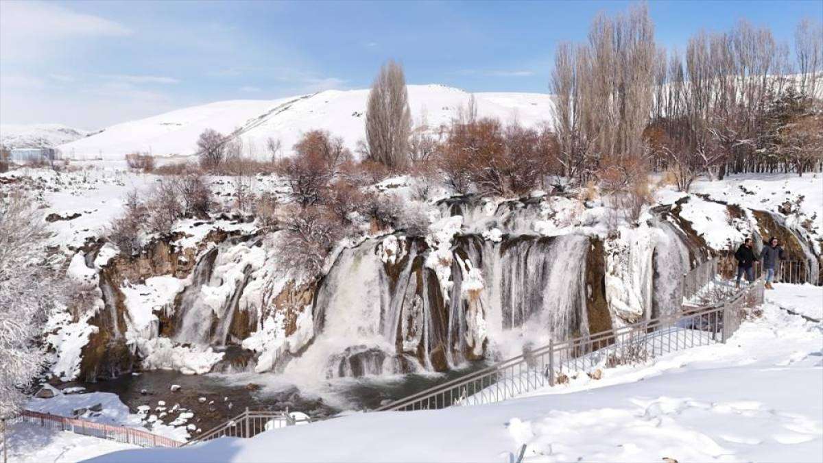 Muradiye ilçesindeki şelale de soğuk havanın etkisiyle kısmen dondu. Şelalenin buz tutan bölümleriyle oluşturduğu manzara dronla görüntülendi.