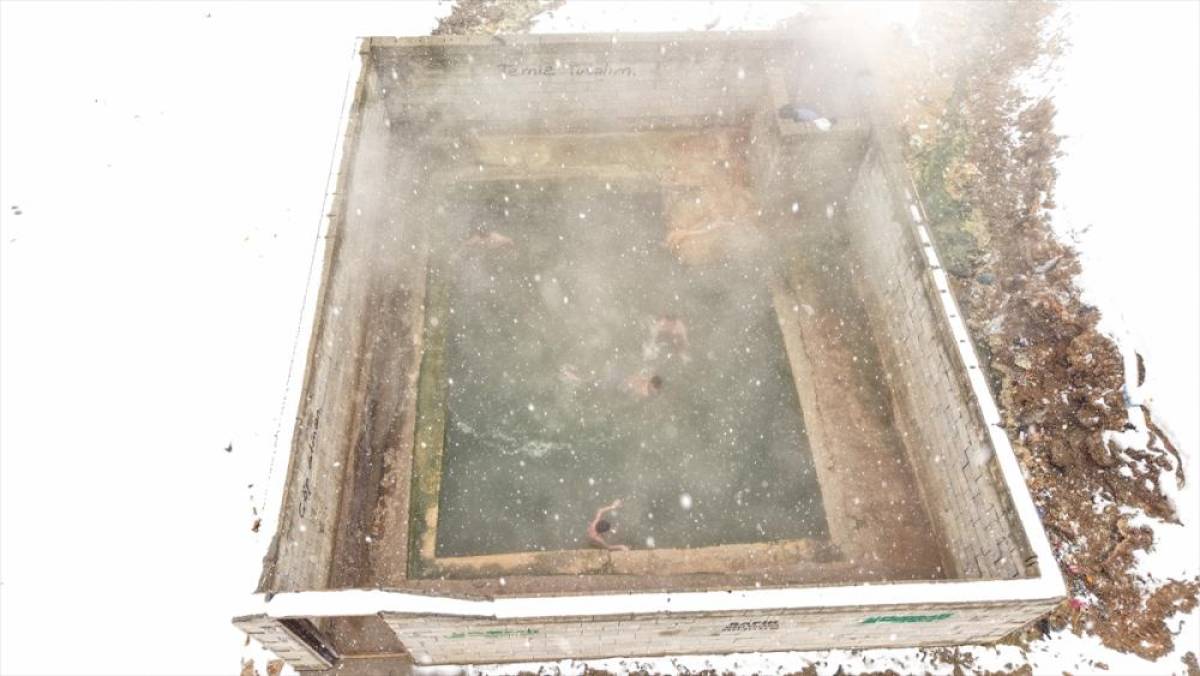Hava sıcaklığının sıfırın altına düştüğü bölgede kar yağışı altında havuza giren vatandaşlar, sıcak suda yüzüyor.