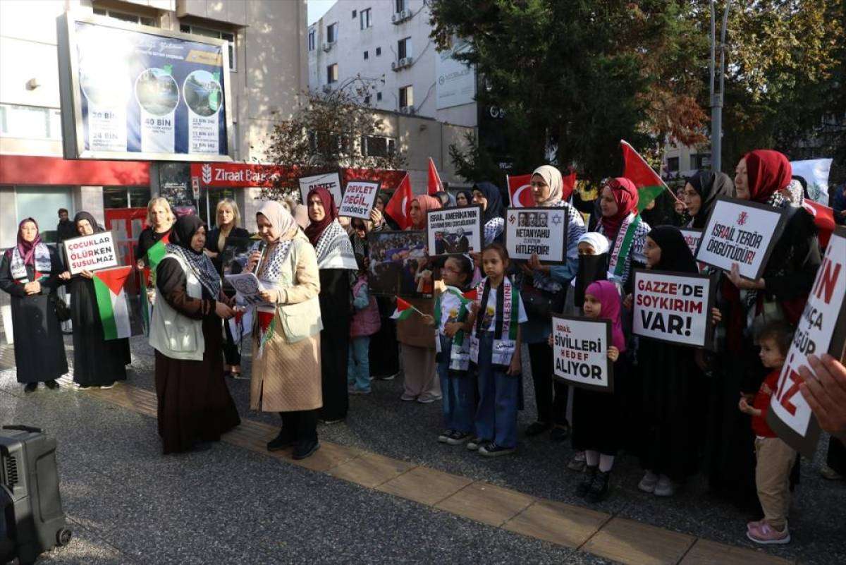 Türkiye ve Filistin bayraklarıyla üzerinde "İsrail terör örgütüdür", "Gazze'de soykırım var", "Filistin özgür olmadıkça hiçbirimiz özgür değiliz", "Gazze ölüyor", "Çocuklar ölürken susulmaz" ve "Netanyahu 21. Yüzyılın Hitleridir" yazan döviz ve pankartlar taşıyan kadın ve çocuklar, İsrail'e tepki gösterdi.