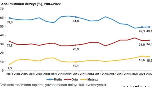 Buna göre, mutlu olduğunu beyan eden 18 ve üzeri yaştaki bireylerin oranı, 2022'de yüzde 49,7 iken 2023'te 3 puan artarak yüzde 52,7'ye yükseldi. Mutsuz olduğunu beyan edenlerin oranı ise 2022'ye göre 2,2 puan azalarak yüzde 15,9'dan yüzde 13,7'ye geriledi.