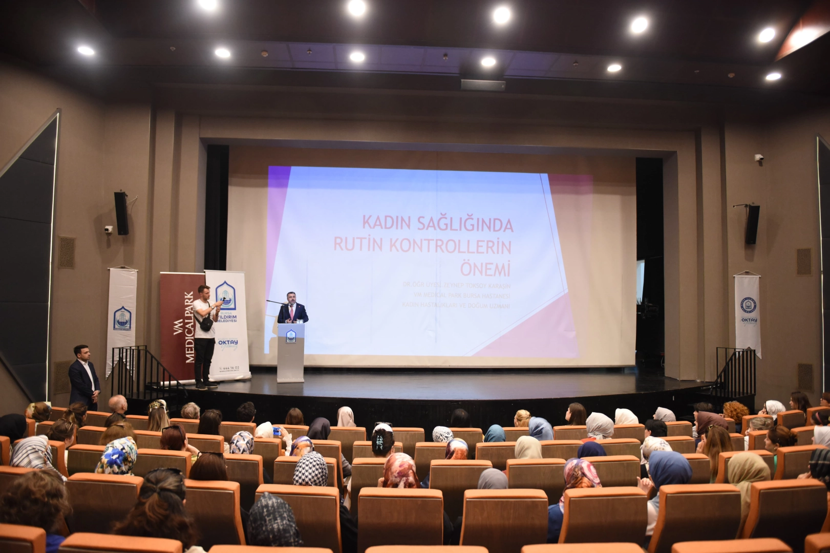 BURSA (İGFA) - Yıldırım Belediyesi ve WM Medical Park Hastanesi iş birliğinde ilçedeki kadınlara ‘sağlıklı yaşamda bilinçlendirme seminerleri’ düzenleniyor. Kadın ve Aile Hizmetleri Müdürlüğü ile Sağlık İşleri Müdürlüğü organizasyonunda Yıldırım’ın 10 farklı noktasında düzenlenecek 10 aylık programlarda kadın doğum uzmanı, diyetisyen, psikolog, estetisyen ve onkoloji doktorlarından oluşan ekip ilçedeki kadınlar ile bir araya gelerek sağlıkta erken teşhisin önemi ve bilinçlendirme üzerine söyleşi gerçekleştirecek ve kadınlar merak ettikleri soruların yanıtlarını uzmanından öğrenmiş olacak. Barış Manço Kültür Merkezi’nde organize edilen programların ilki Op. Dr. Zeynep Toksoy Karaşin’in anlatımıyla ‘ Kadın Sağlığında Rutin Kontrollerin Önemi’ konulu seminer ile başladı. Programa Yıldırım Belediye Başkanı Oktay Yılmaz, AK Parti Bursa Milletvekili Emel Gözükara Durmaz, VM Medicalpark Bursa Hastanesi Başhekimi Muhammed İkbal Bakırcı ve kadınlar katıldı.
