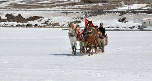 Yüzeyi kar ve buzla kaplı Çıldır Gölü'nde atlı kızak heyecanı sürüyor